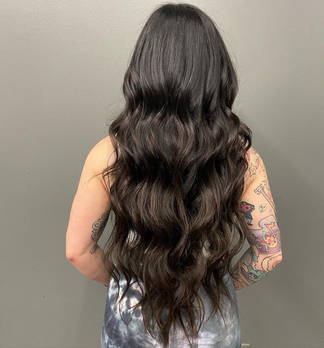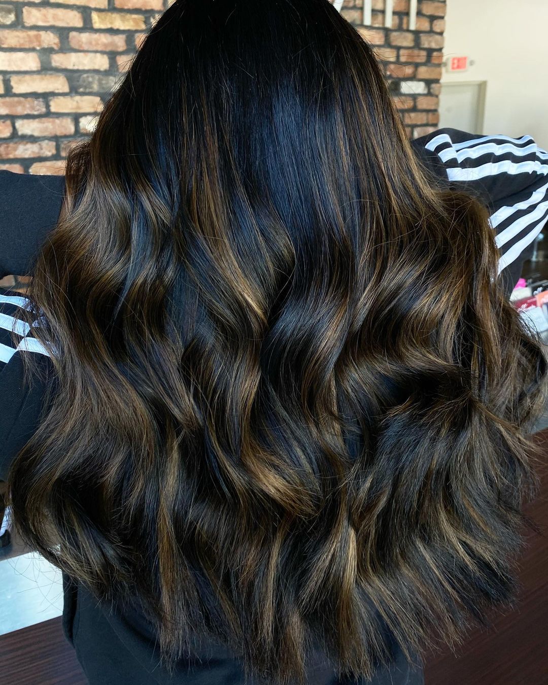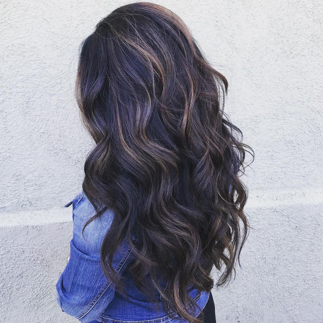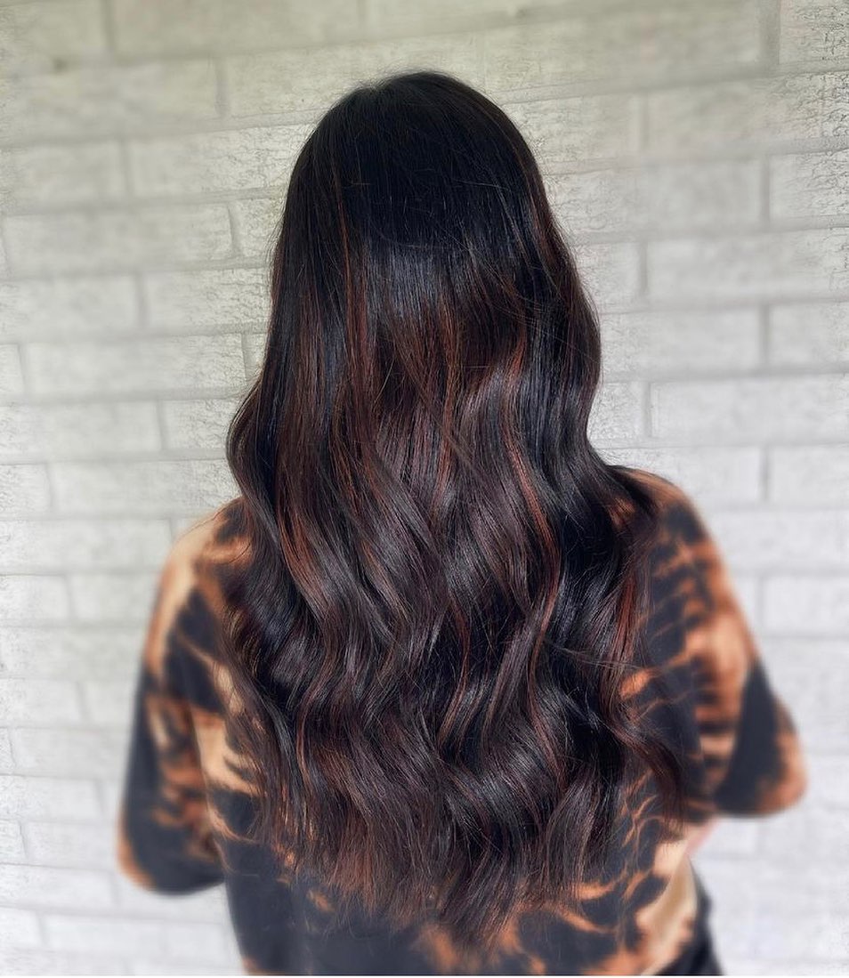 If you’re a fan of long, straight hair, why not give this a try? These dark black balayage highlights add a layer of depth and dimension that is just so stunning.