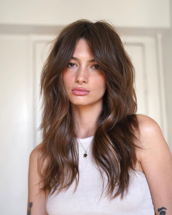 An off-center part adds to the carefree, tousled nature of this long shag. It allows the layers and bangs to flow seamlessly.