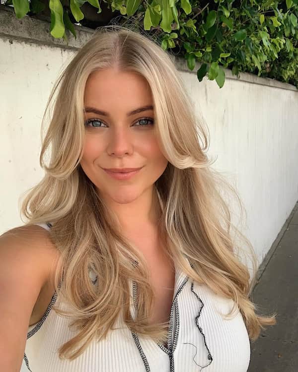 11. Blonde Layered Haircut with Curved Ends and Curtain Bangs