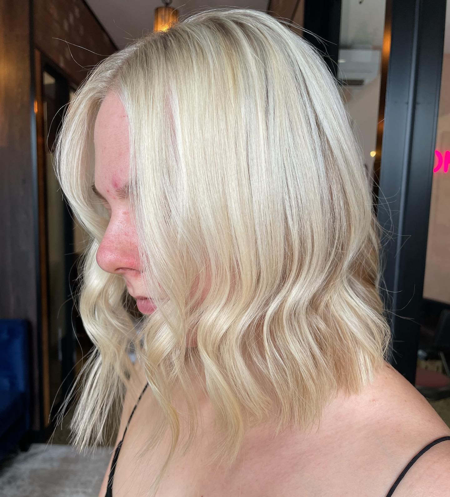A side-swept blonde style with just a little bit of curl has such a feminine and stylish vibe. I’m obsessed with this whole look.