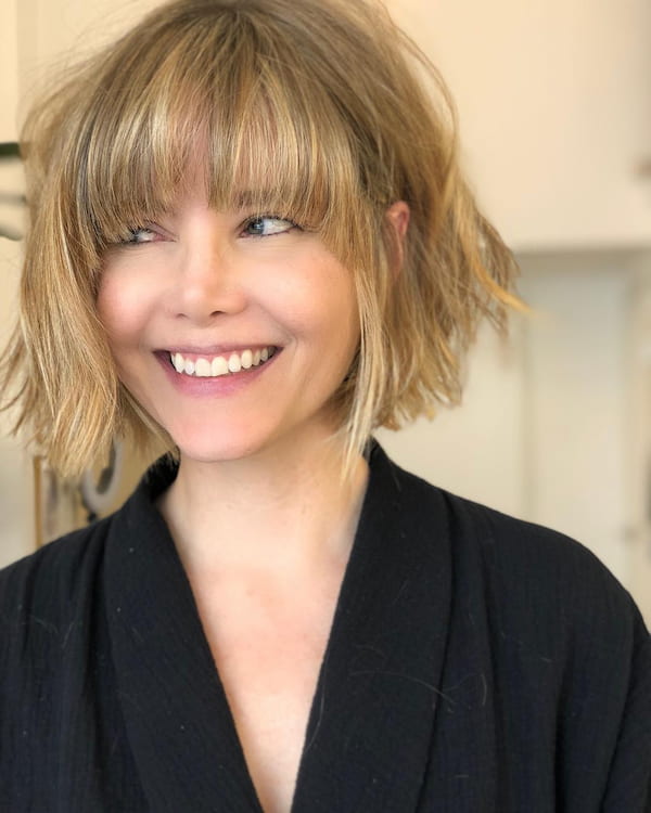 Styling a textured bob with baby bangs creates a stylish, edgy bob haircut.