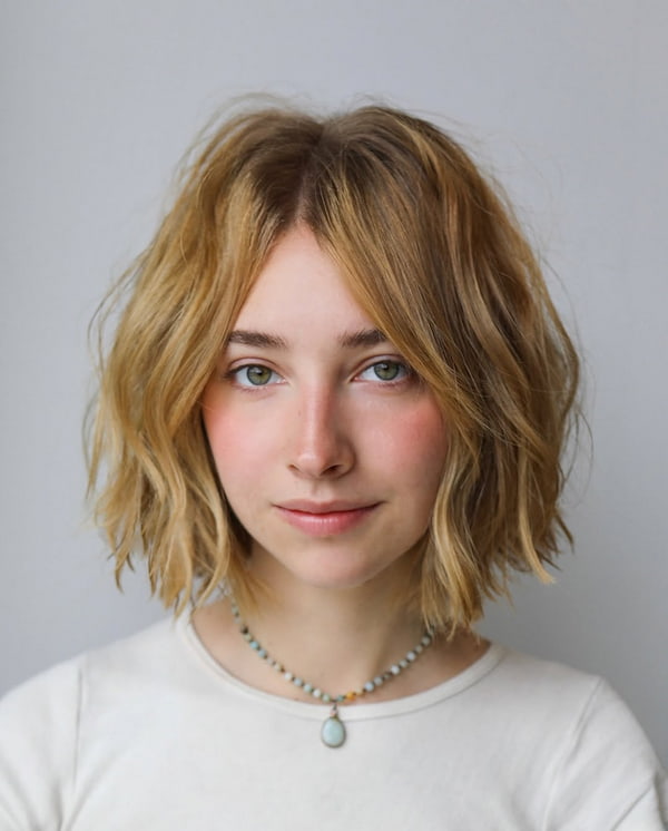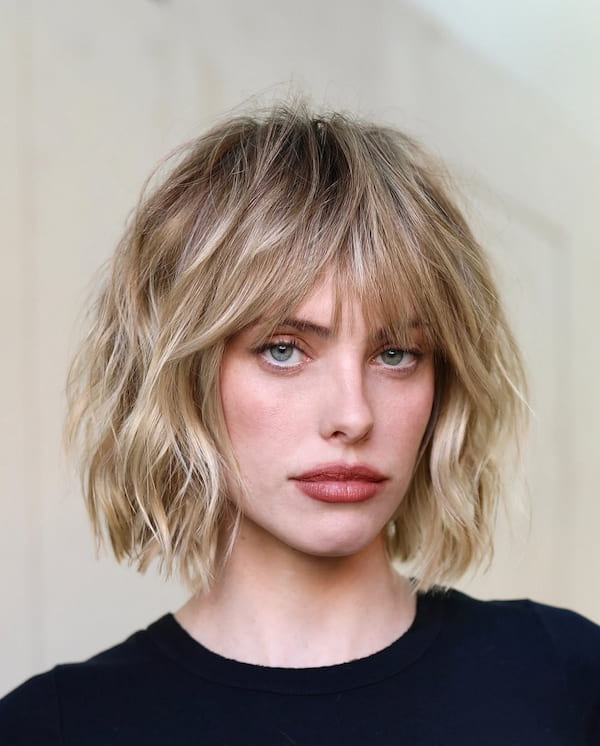 These short, blunt bangs give the look a youthful, quirky vibe while keeping that textured feel. It is a fantastic option for oval faces.