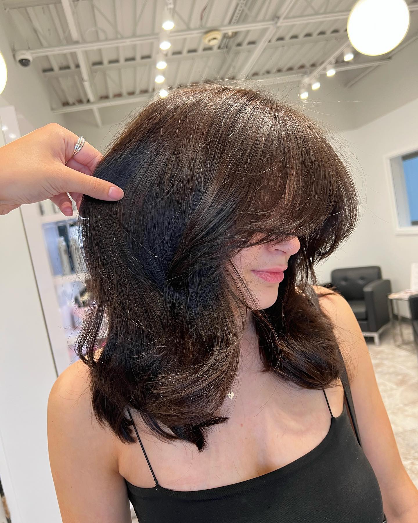 I am so into this vibe. This long dark brown hairstyle with wispy bangs is an ideal choice for anyone who loves a stylish and defined A-bob look.