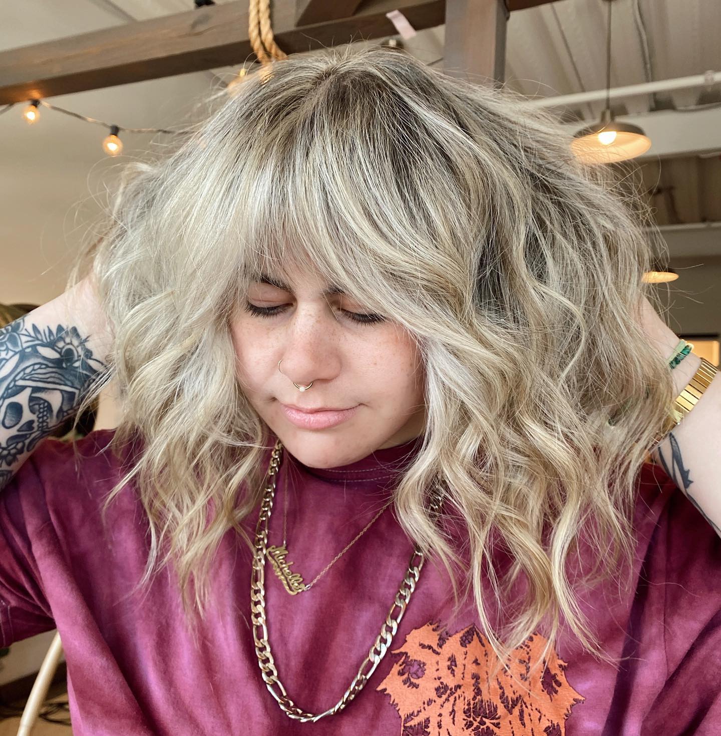 Blonde hair paired with these longer wispy bangs creates such a stylish result. I think it looks amazing on women in their twenties. Just be ready for regular toning appointments to keep the design looking fresh.