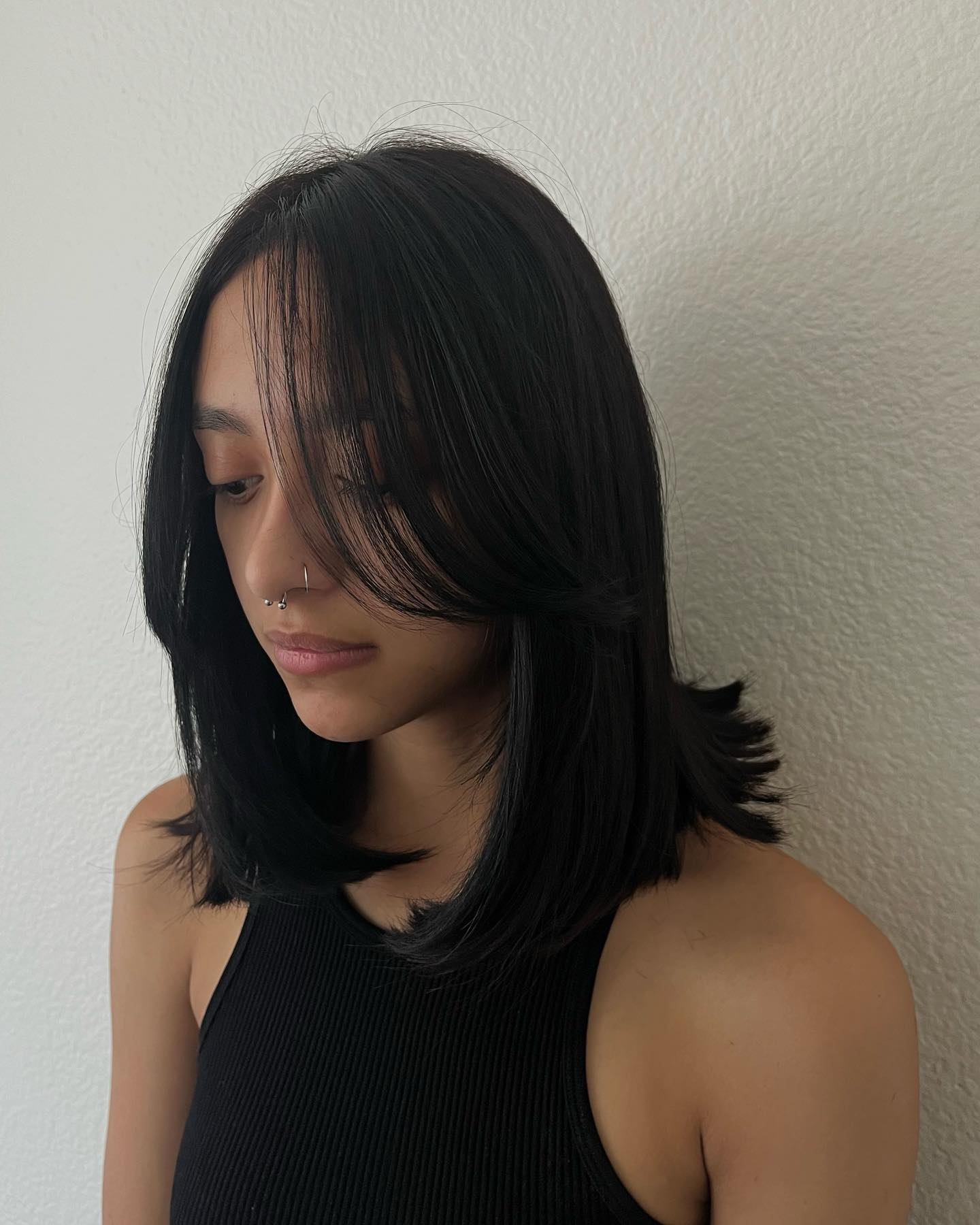 This shiny black hairstyle with defined edges and curtain bangs has such a feminine and flirty feel. Use your go-to hairspray to get this level of shine and elegance.