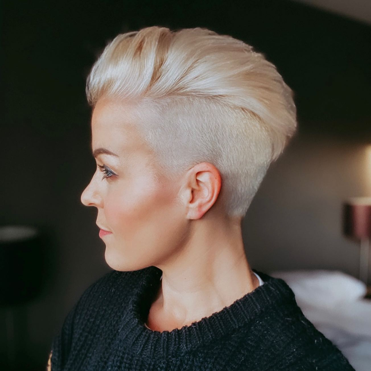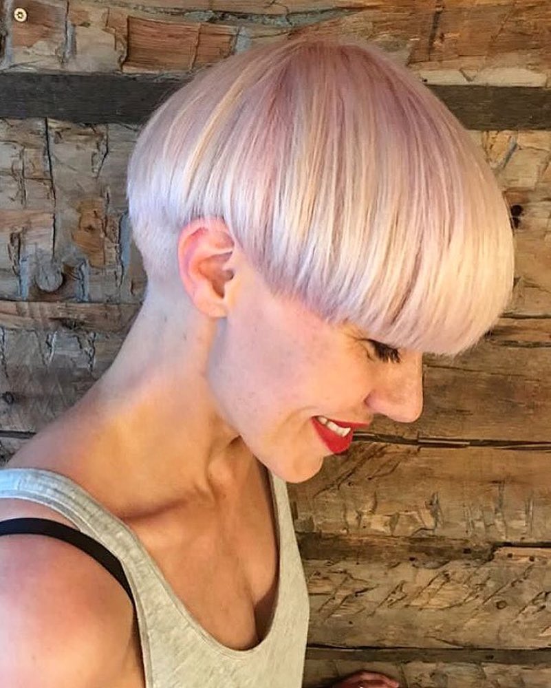 This icy blonde pixie with its fiercely defined bangs is for anyone who loves a dramatic and glamorous look for every day. I am such a fan of this bold style.