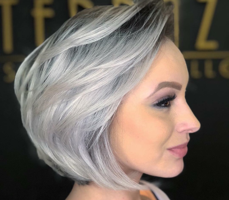 This layered silver bob is so beautiful and a great way to show off your own personal style. The layers throughout the hair give it a lot of volume and texture, and the color is simply amazing.