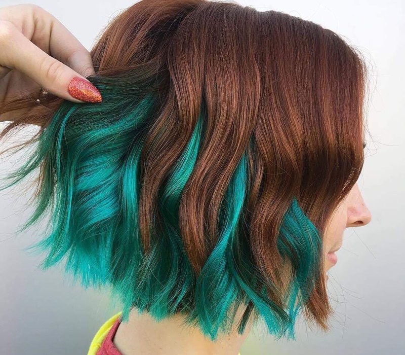 I mean, this bob is absolutely wild in the best possible way. Keep your natural shade on the top layer and then go for it on the bottom with a bright fashion color, like this amazing teal.