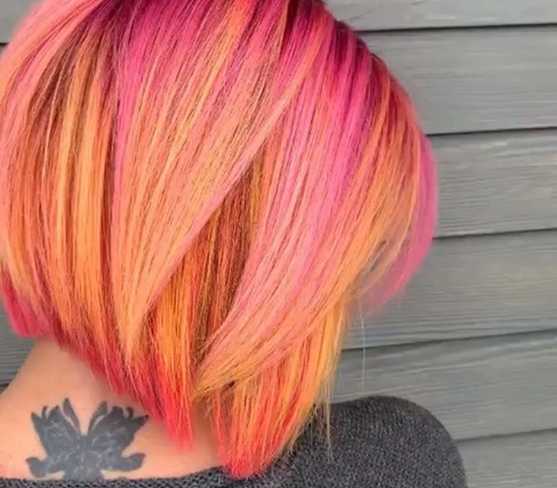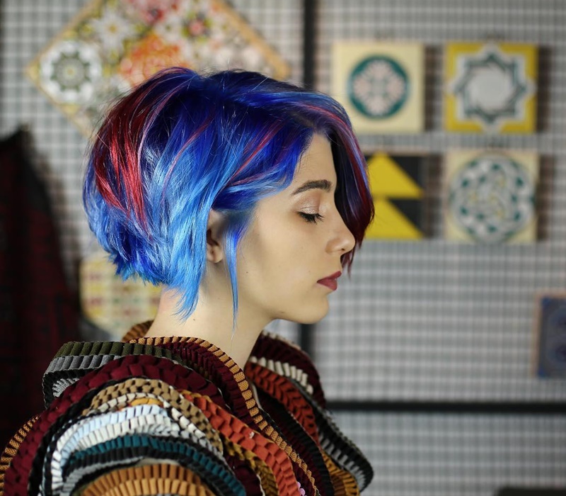 The bright colors will draw a lot of attention to your hair and the bob cut, which is rounded and angled, pairs so nicely with this dope color.