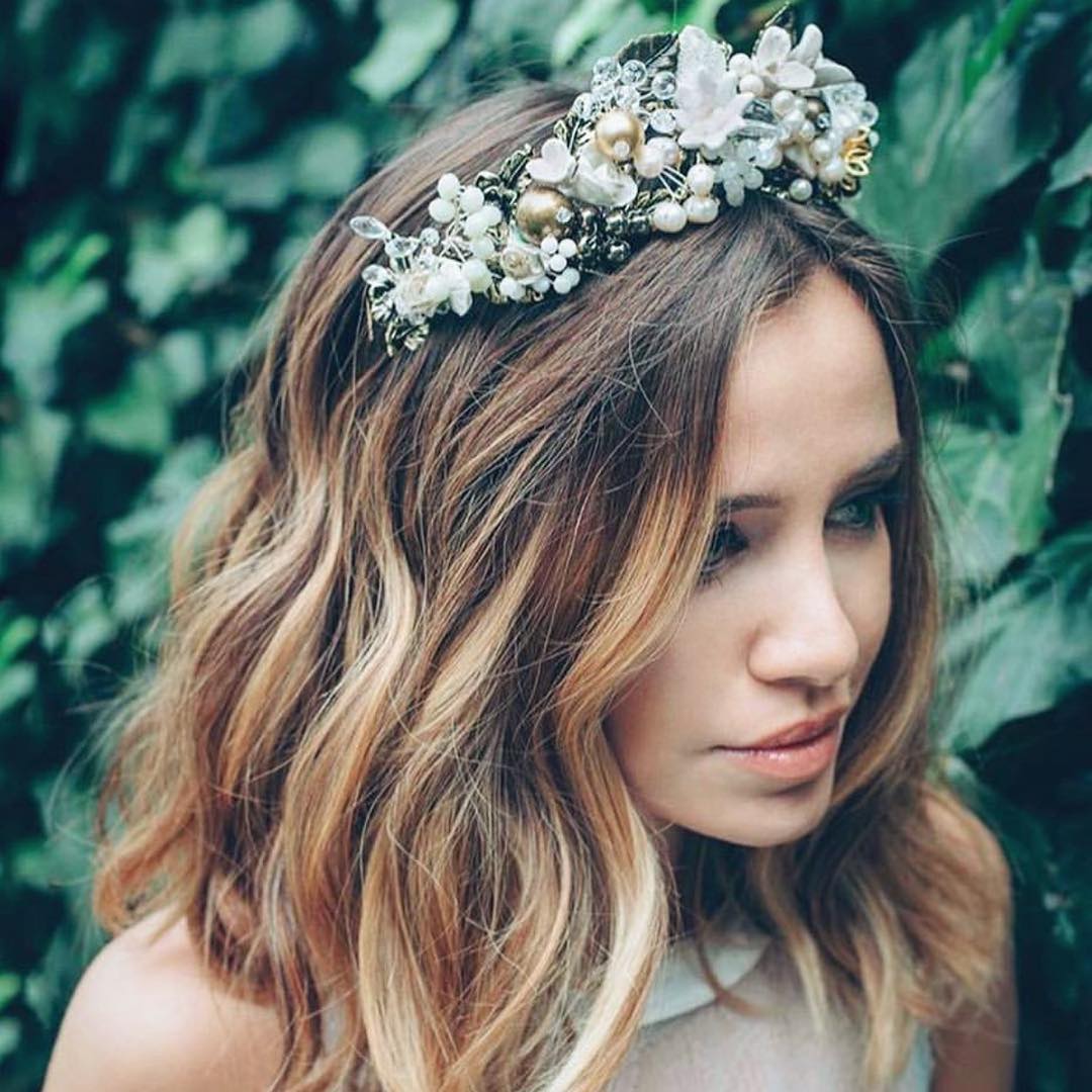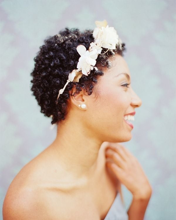 This pixie style is so cute. Just part your hair to one side and give it some good volume. A dainty flower crown is the perfect finishing touch and makes this look ideal for any wedding.