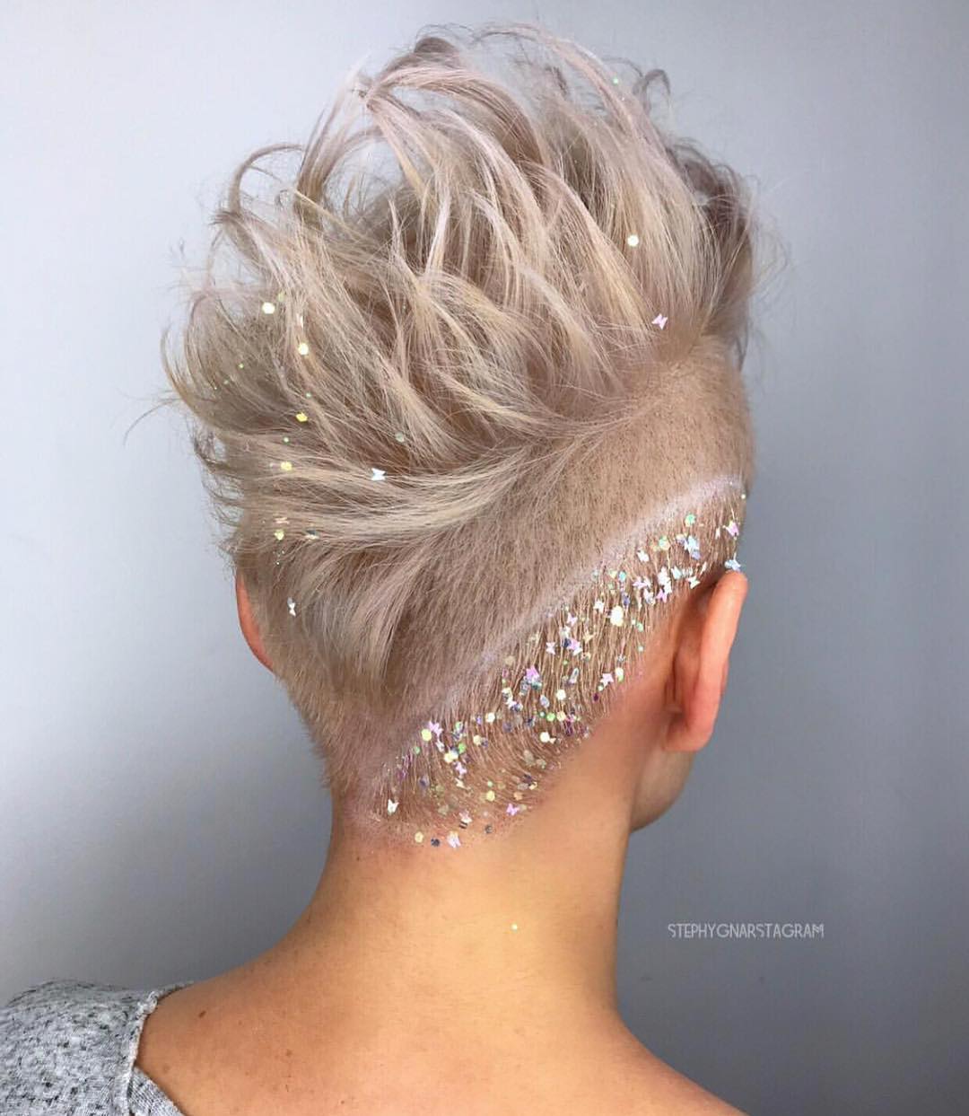 Feeling a little funky? I love this idea. Add some glitter to your pixie cut for a fun and unexpected touch. The party will definitely get started once you show up with this look!