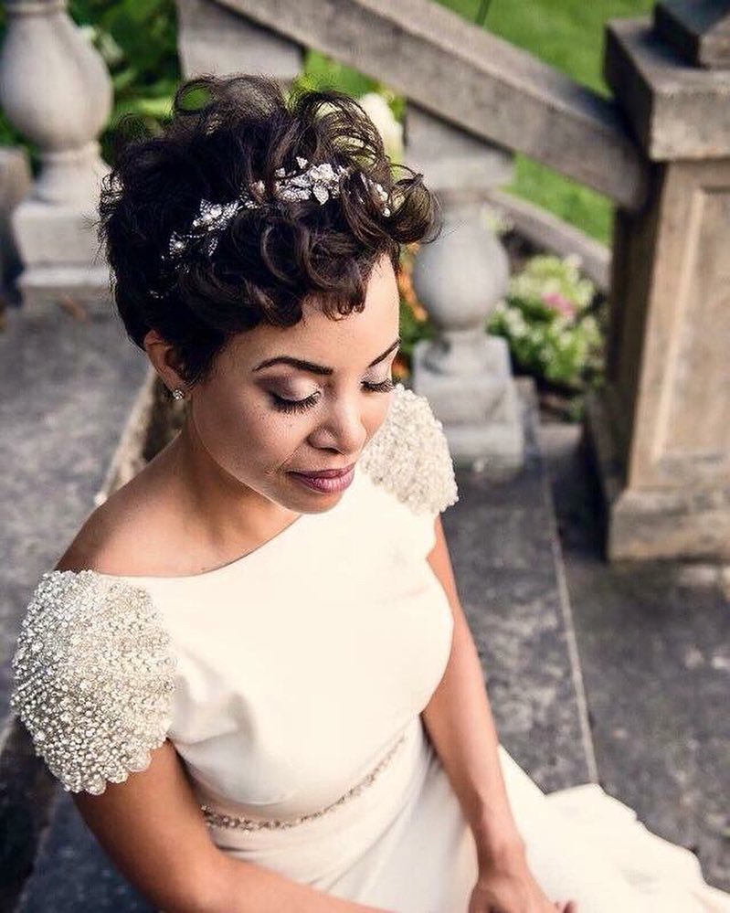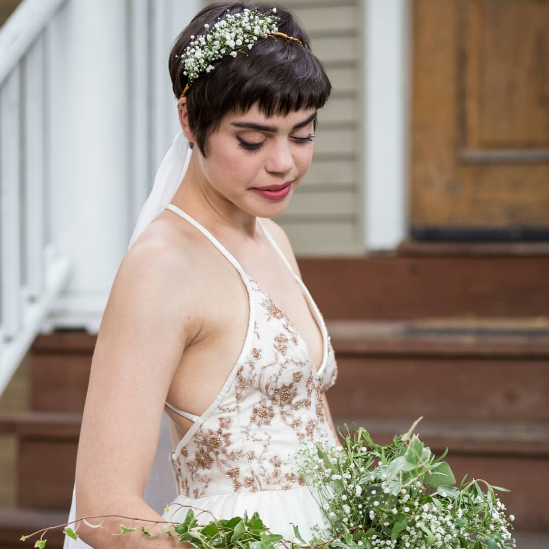 Honestly, you don’t have to do a ton to your pixie cut to look absolutely stunning on your wedding day. Sometimes simple is best! Just add a crown and a veil, and you are all set to go. How easy is that?!