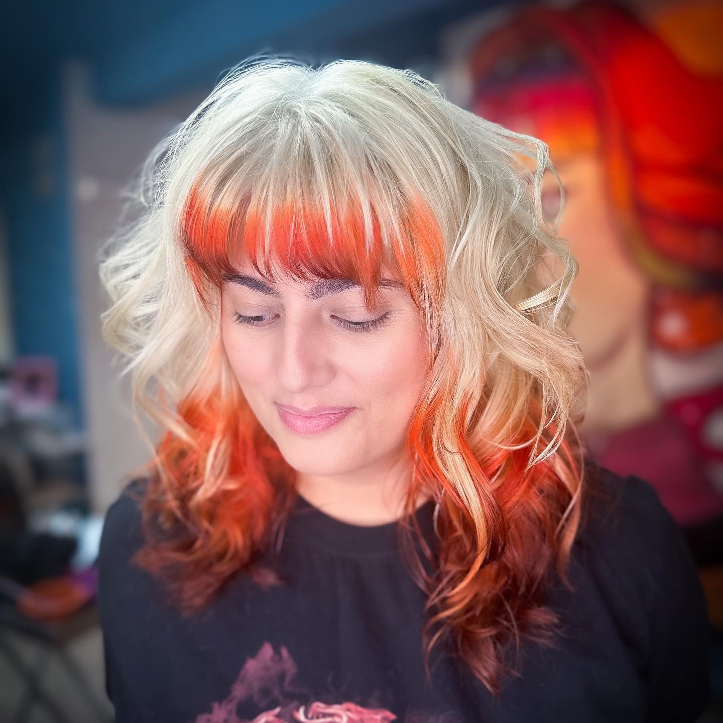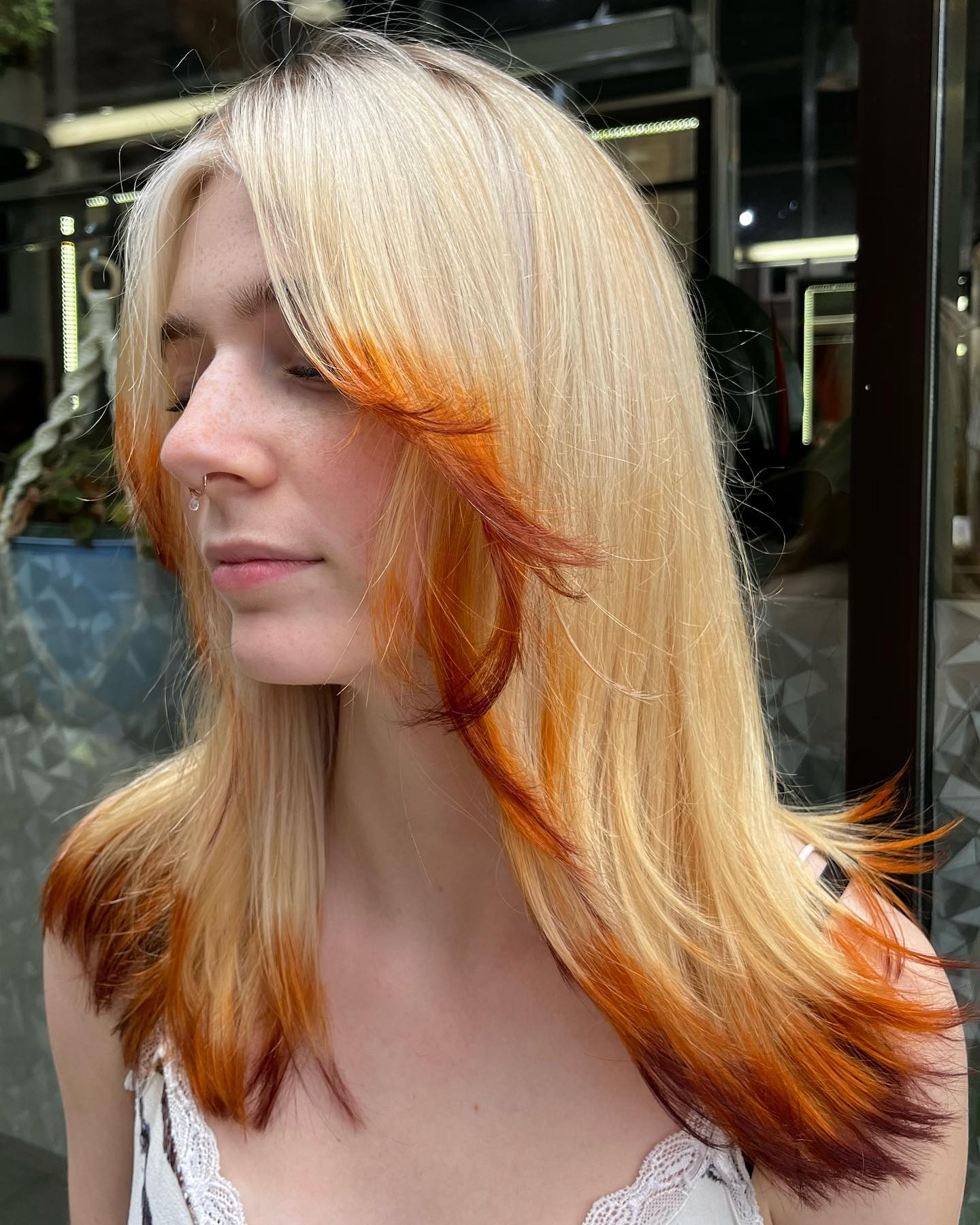 An orange hair color is always connected with warmth and energy, which I think is so much fun. What’s interesting is that it comes in a ton of different hues, from fiery copper tones to softer, peachy shades.