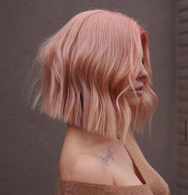 This peach colored layered bob adds warmth and playfulness to your look, creating a vibrant take on the classic bob.
