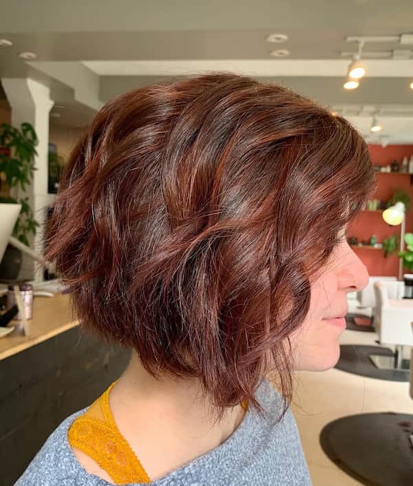 This is a voluminous, side parted bob with cascading waves that women of all ages can style.