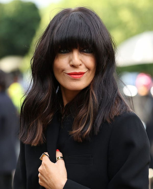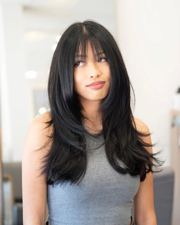 Face-framing bangs perfectly complement layered hair, whether it is short or long.