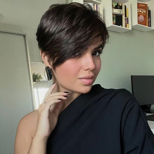 Side-swept bangs add a sleek touch to a pixie bob, which I think is just stunning. This gives it an asymmetrical element for a unique and textured look.