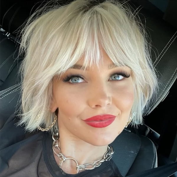 You can pair a short haircut with wispy bangs to soften the edges of the cut.