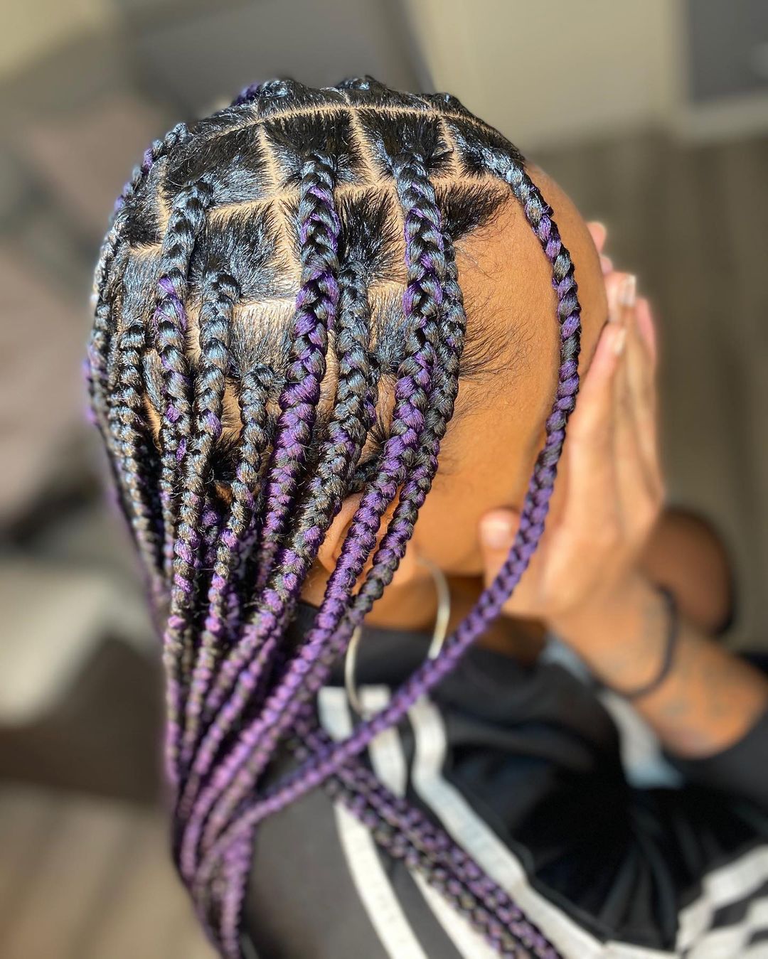 A pop of purple is always a good idea in my book. It’s such a beautiful and unexpected color to wear with cornrows, and it really makes a statement.