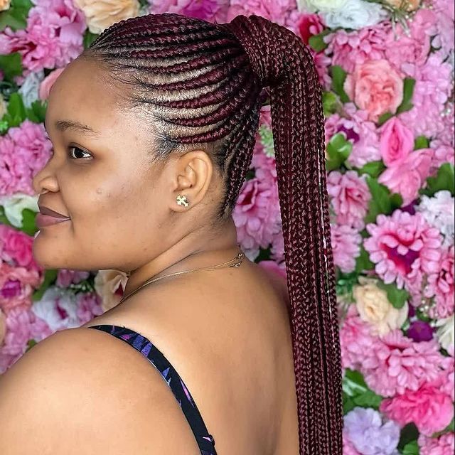Weaving some rich burgundy hues through your cornrows is such a stunning choice. The color adds so much depth and personality to the whole look.