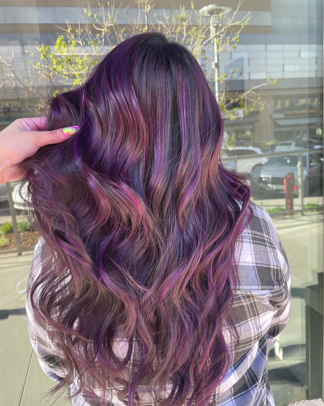 You can liven up your purple hair even more with tinsel. I love this combination.