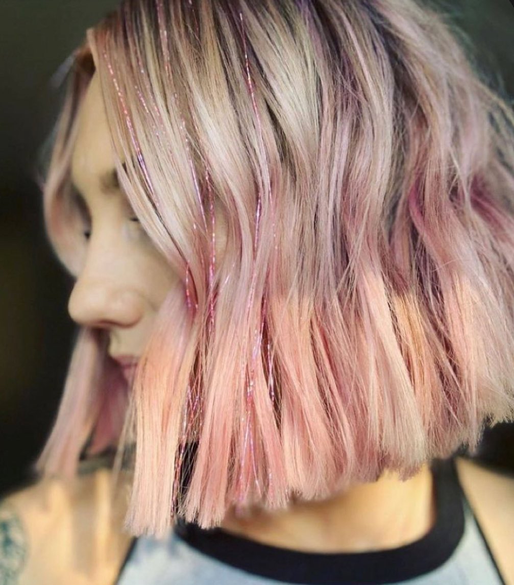 Rose-colored hair is already so on-trend, and adding a bit more detail with tinsel is just *chef’s kiss*.