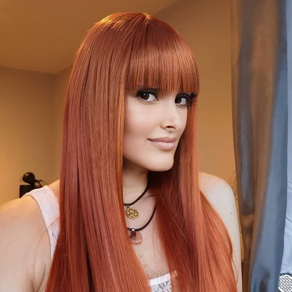 14. Orange Hair With Blunt Bangs For Oval Faces