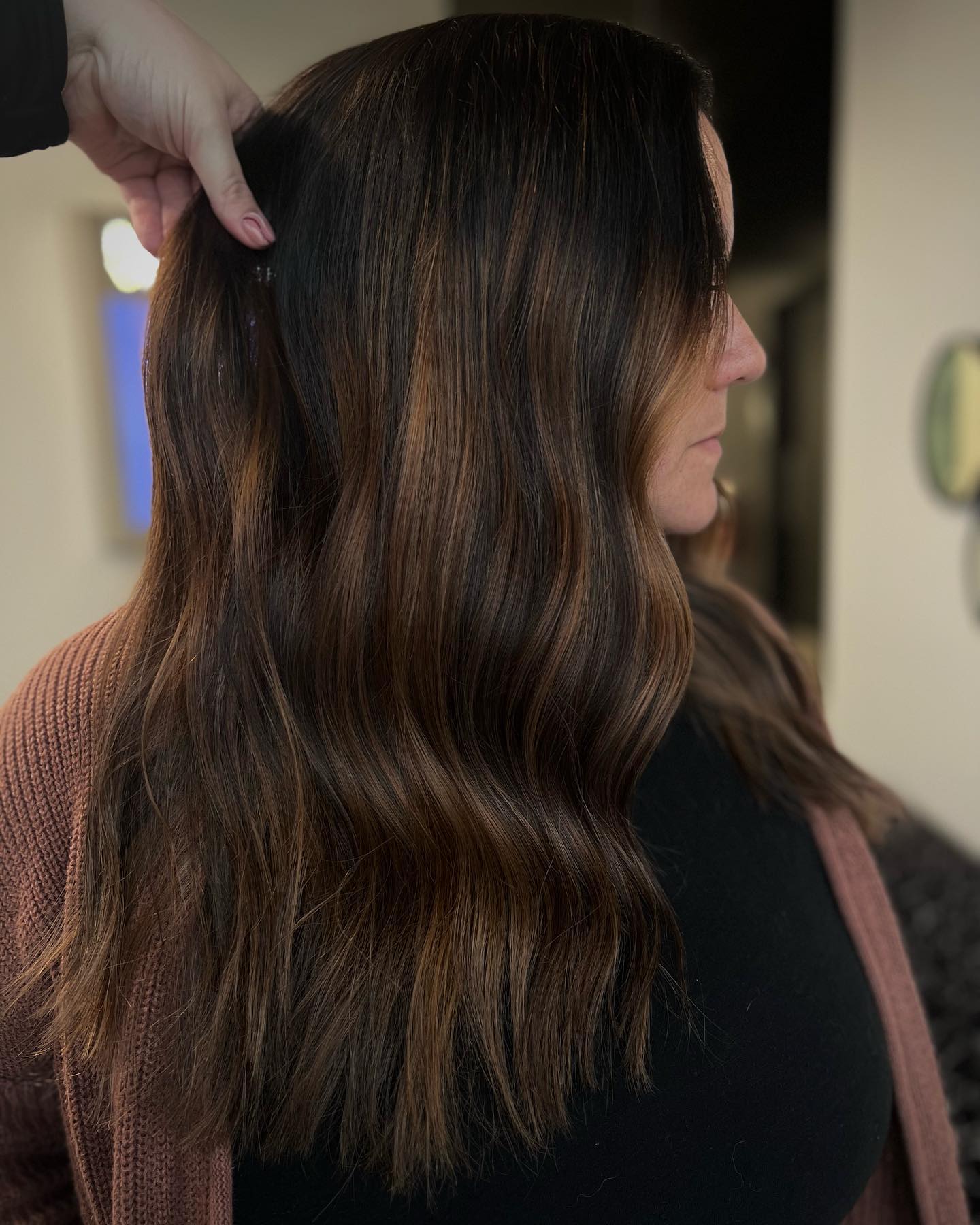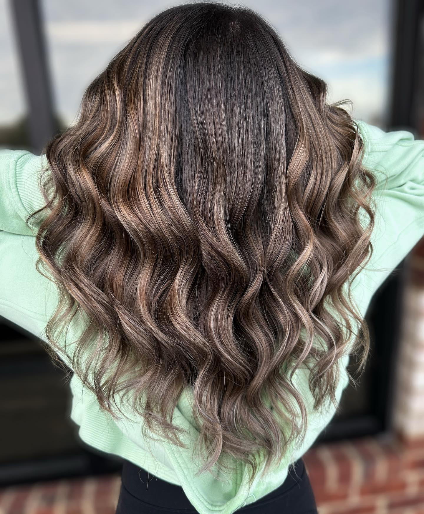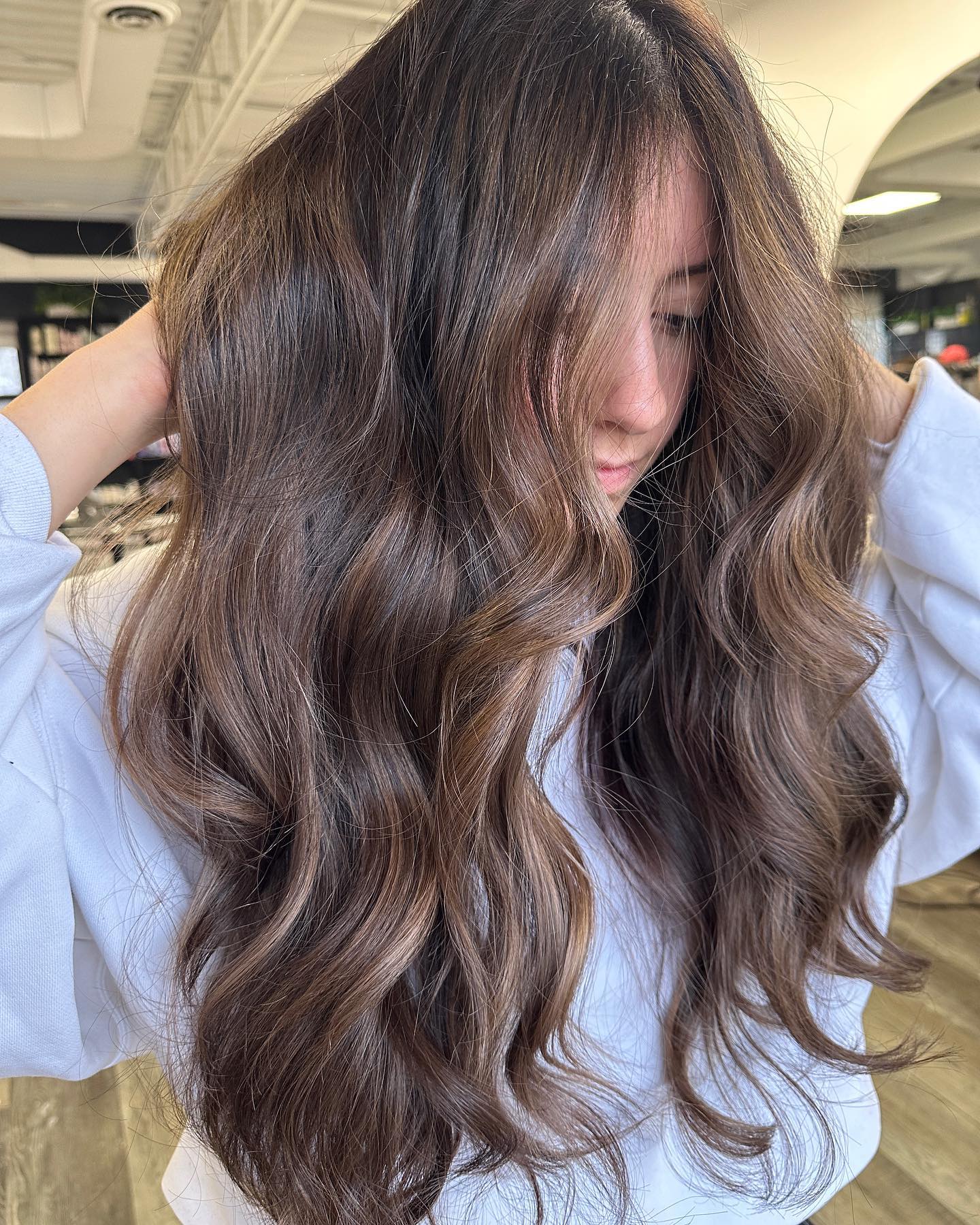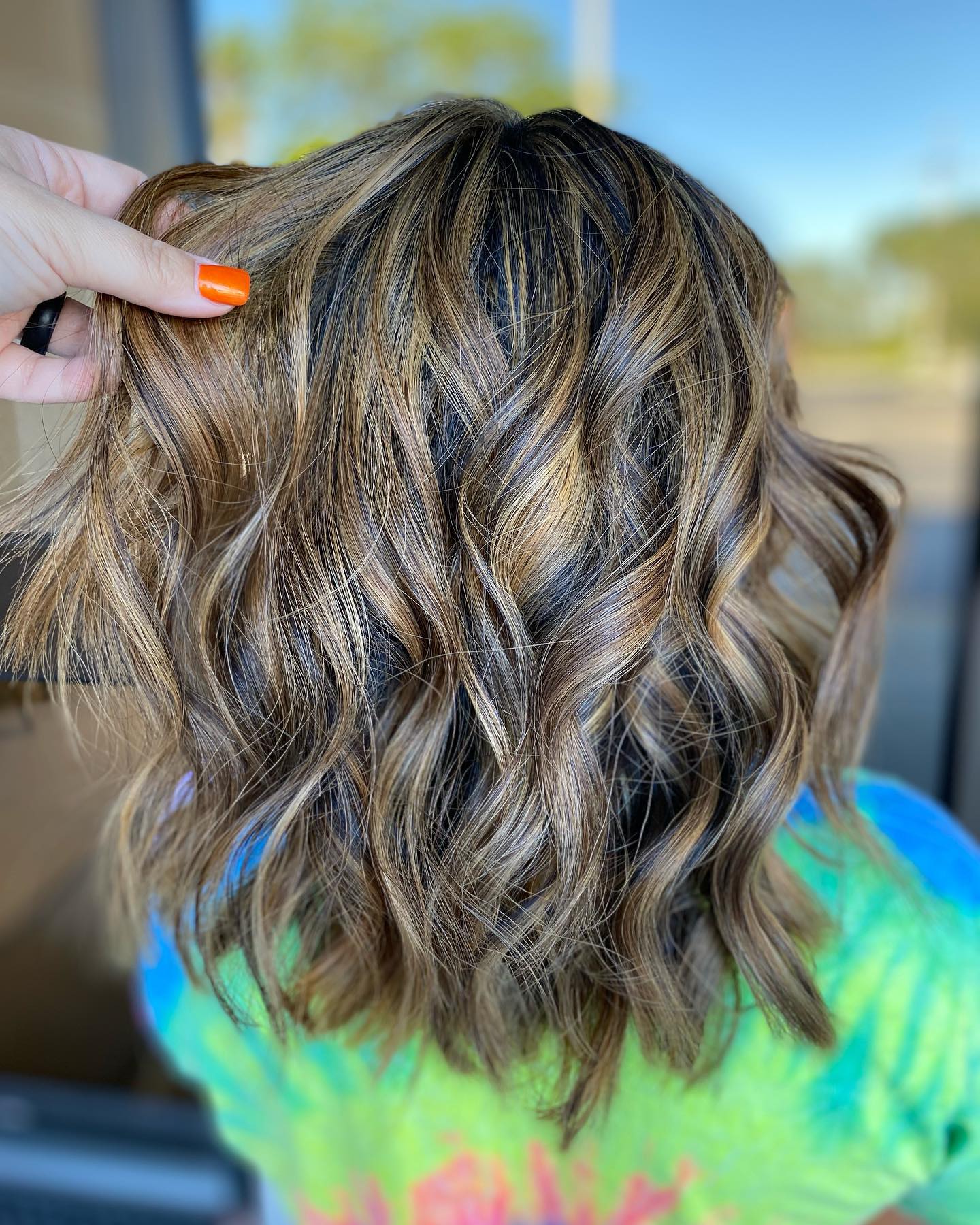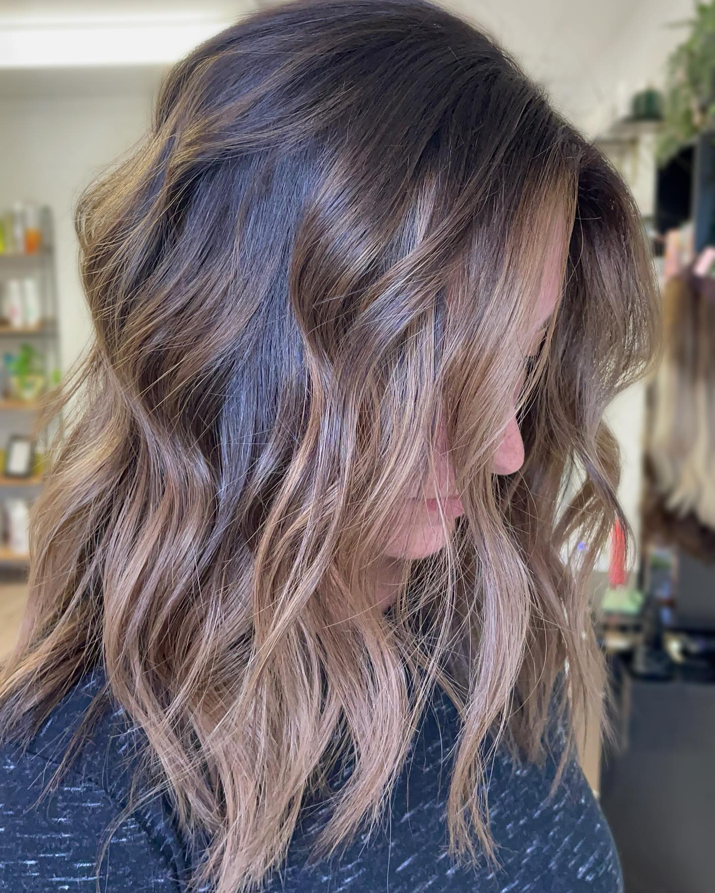 I love these chocolate brown mushroom highlights for freshening up a look. If you’re a fan of warm-tone ideas and enjoy stylish hairdos that are popular for the summer, this is it!