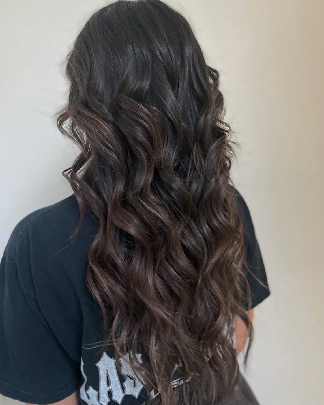 A long mushroom brown hairdo like this one is super voluminous and wispy.