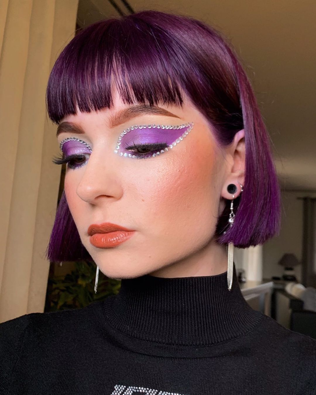 I love this entire vibe. You can get a great plum hair color and then decorate it with these super funky fringe bangs.