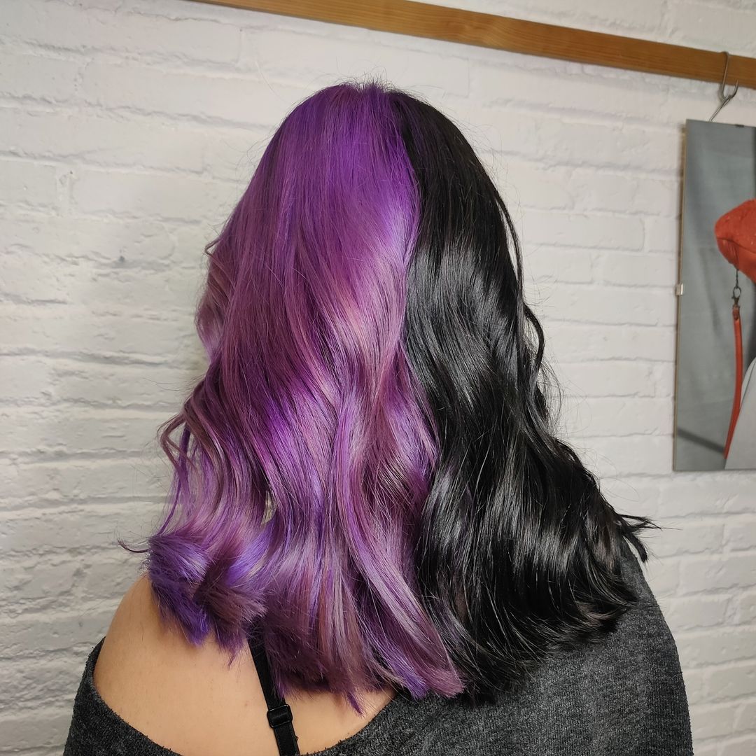 If you are a fan of dramatic colors and love a unique look, this is the one for you. I think combining half black with half plum hair dye is such a cool idea!