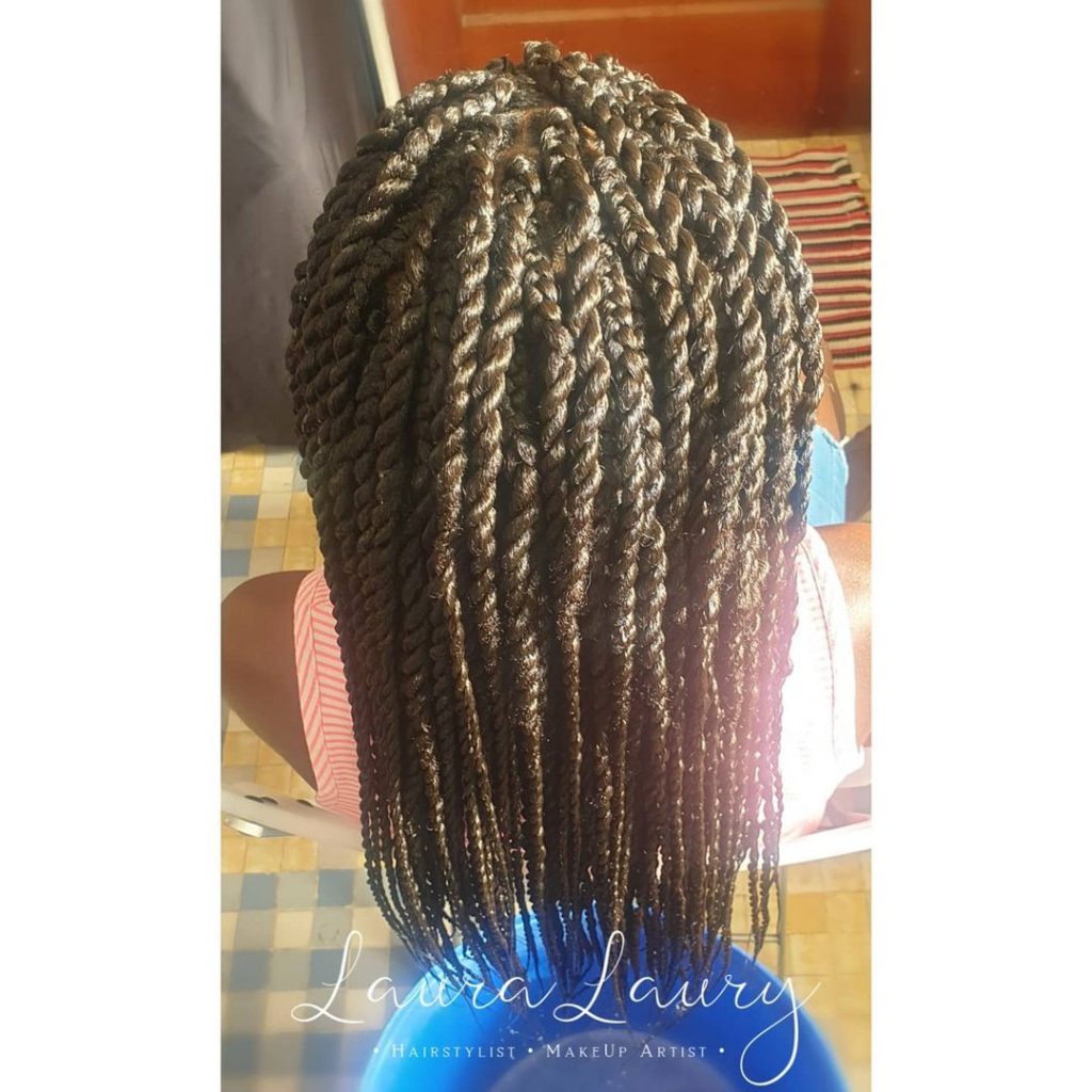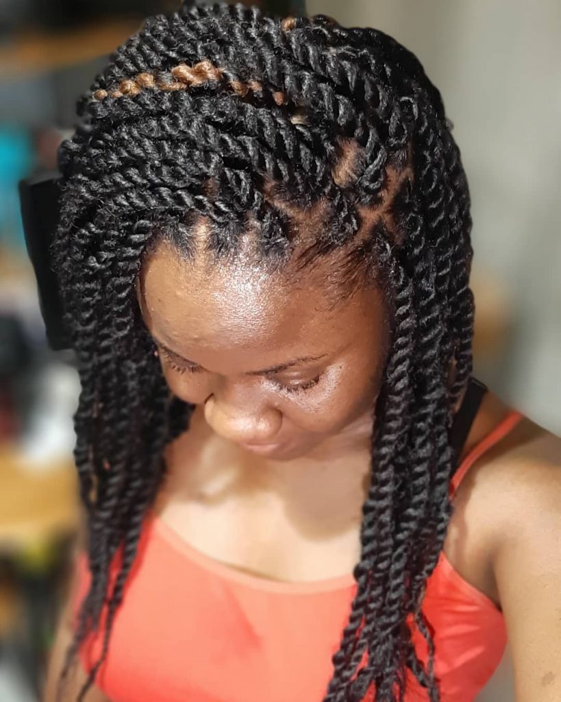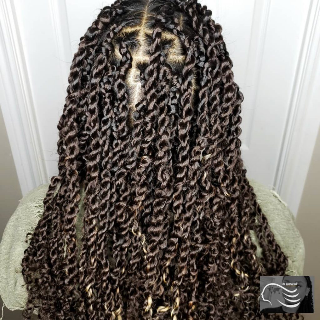 Take your twists to the next level by styling them further. Braiding your twists into a new look is a stunning way to change things up.