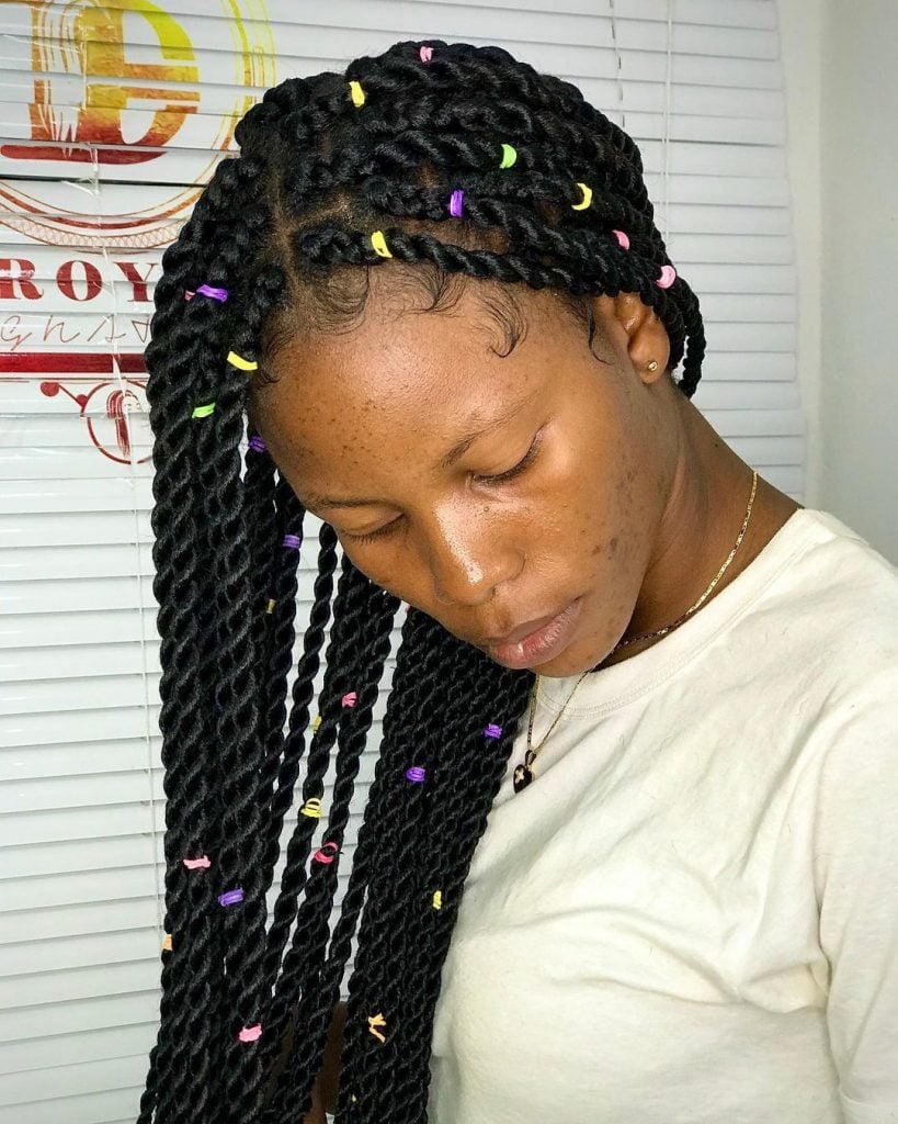 Multi-colored bands are such a fun way to bring a pop of color to your hairstyle. It’s an easy addition that really makes your twists stand out.