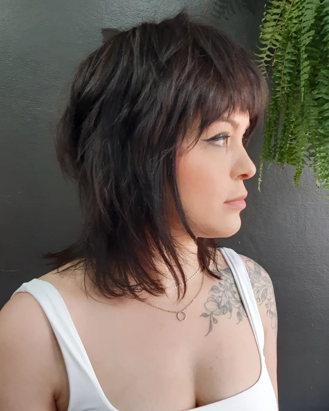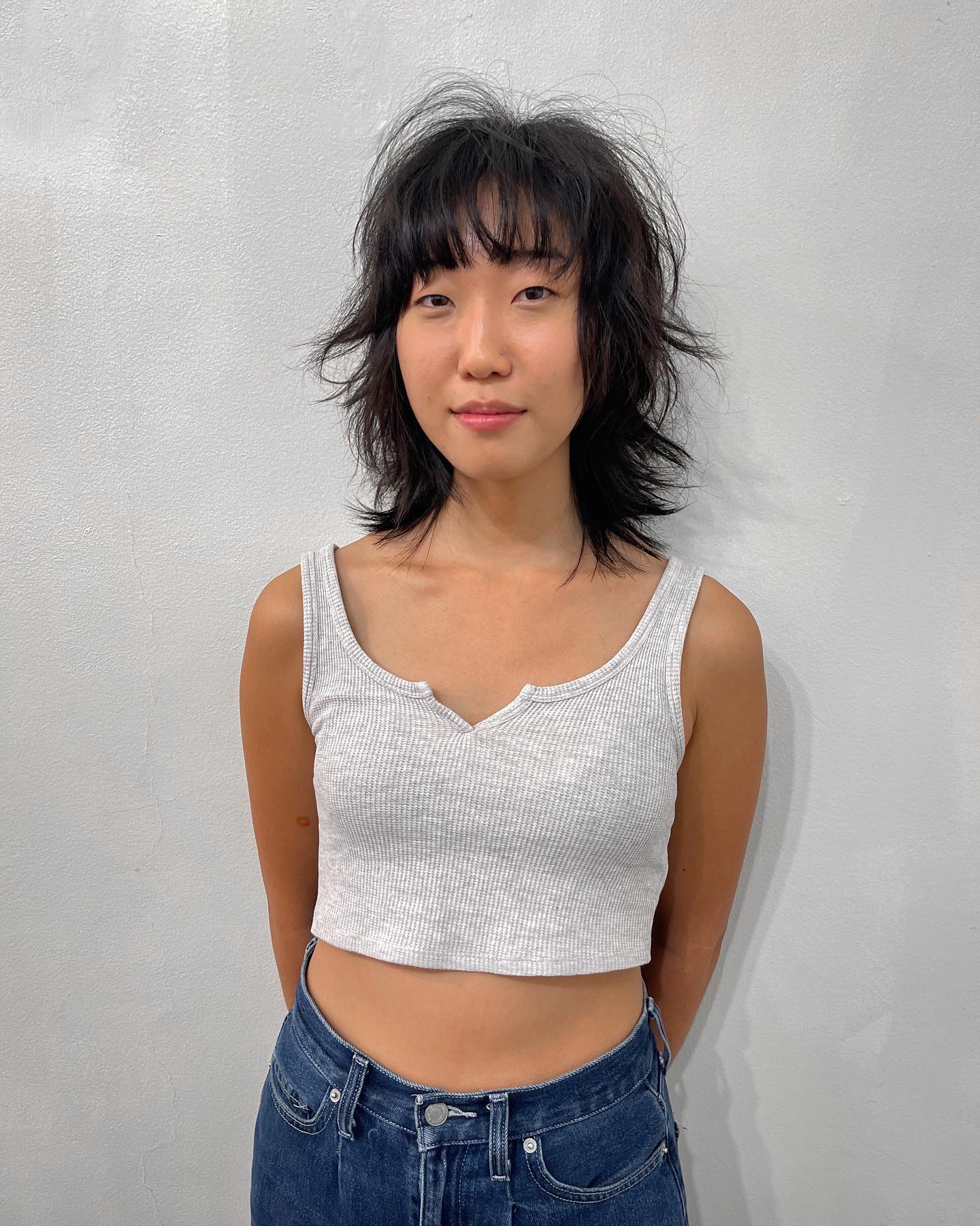 This shaggy hairdo with cool bangs is so defined and chic, plus it feels totally modern. You can style it with your favorite hairspray on top to get this exact outcome and to also make the style last longer.