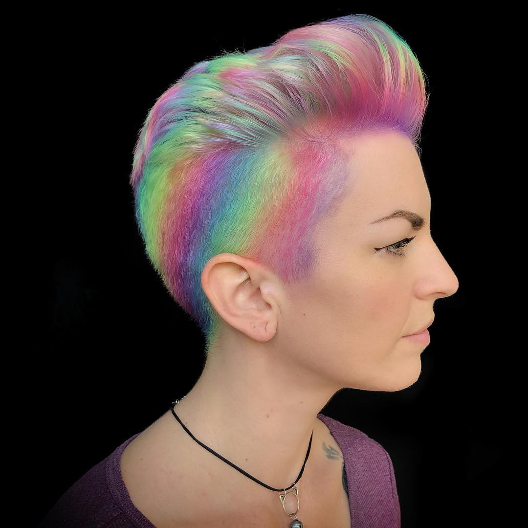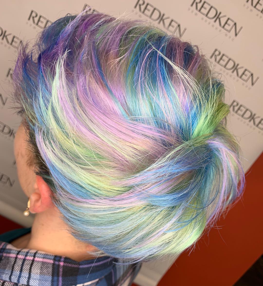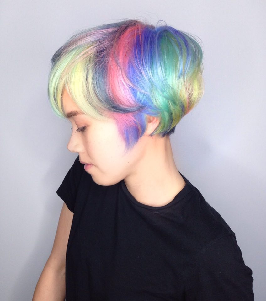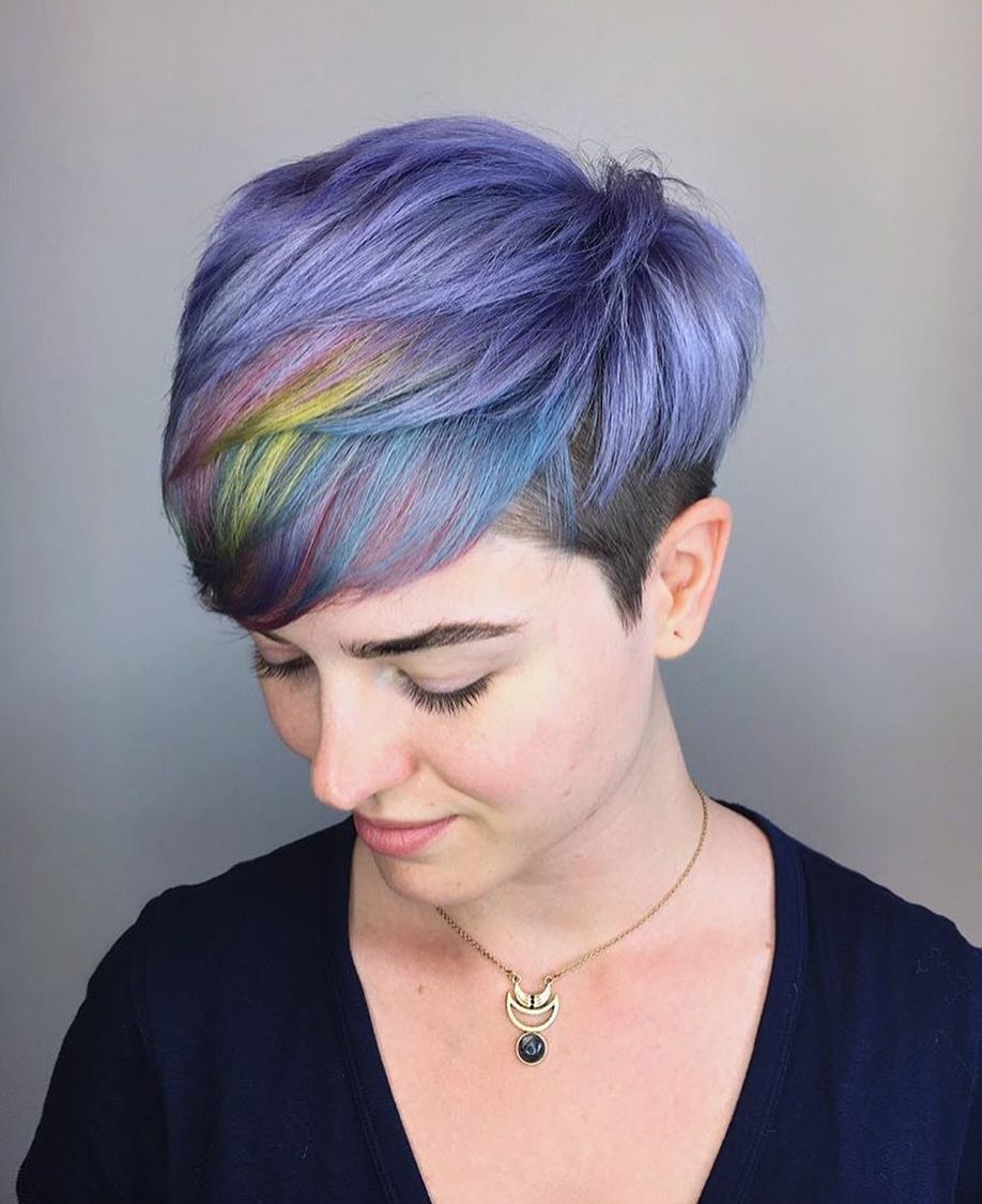 If you want to enhance your pixie cut just a tad, this is the way to do it. Adding a soft mix of purples, blues, yellow, and pinks creates such a beautiful, subtle rainbow effect.