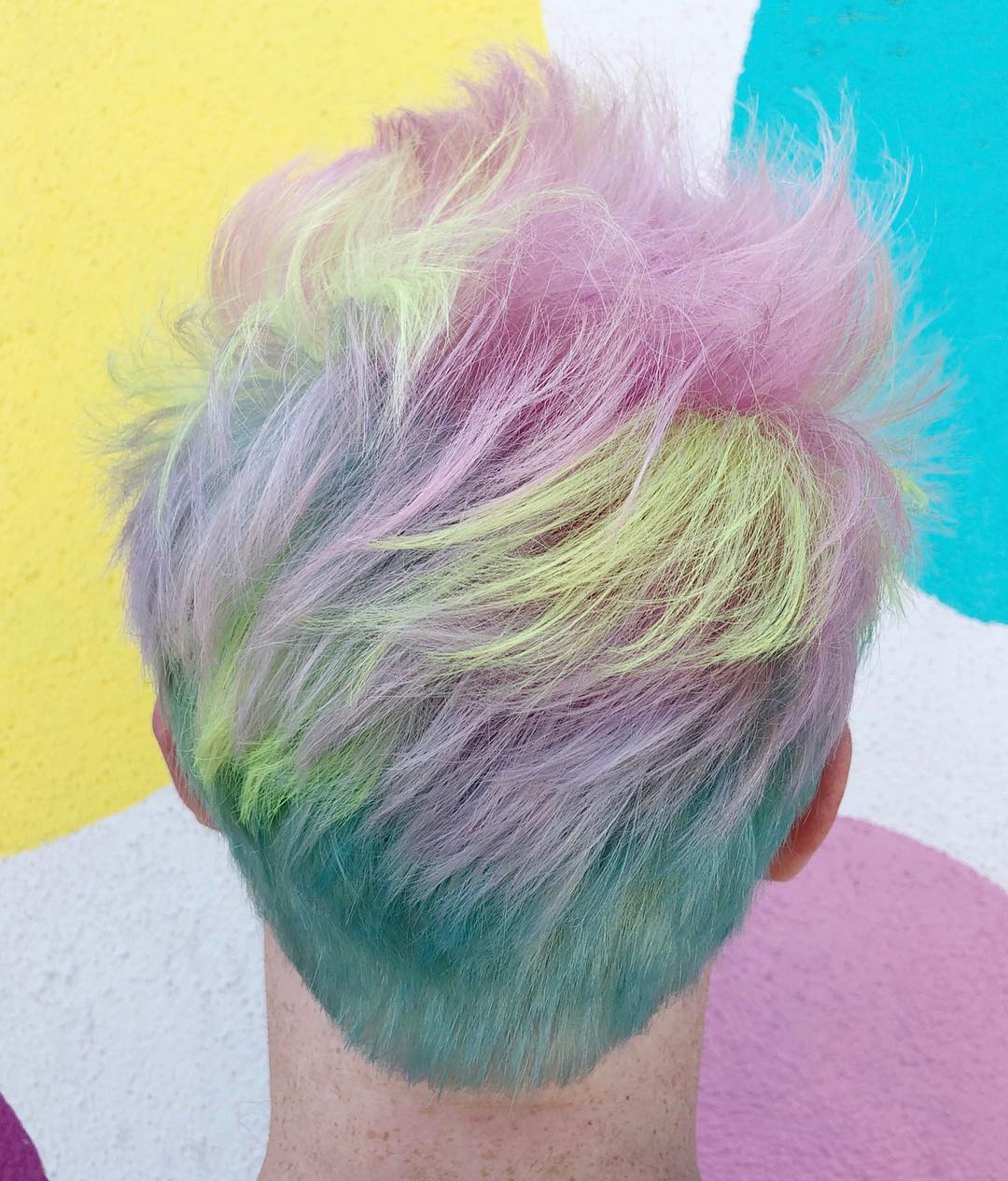 Take your spiked pixie to the next level. This amazing mixture of yellow, pink, and blue gives it a total cotton candy vibe that looks incredible.