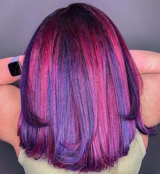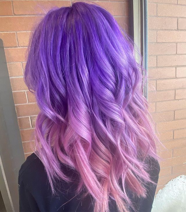 Let’s talk about this game changer of a look. Purple roots that blend into a sunset of colors? Yes, please. This is an absolute showstopper.