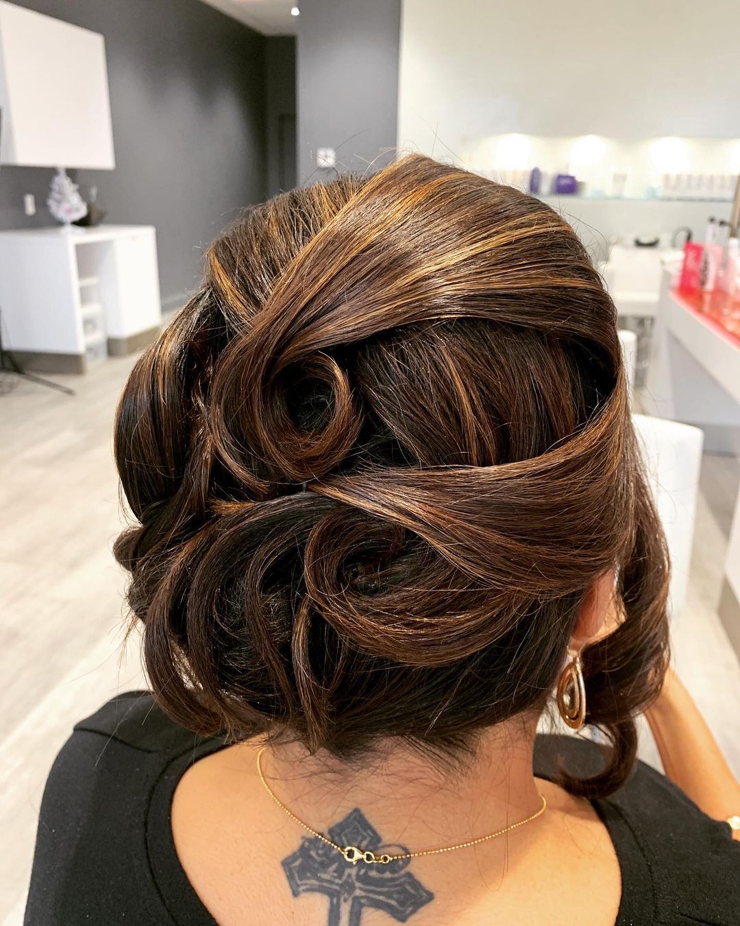 This gorgeous curled knot is completely achievable with short hair. It has so much elegance and looks like it belongs at a black-tie event.