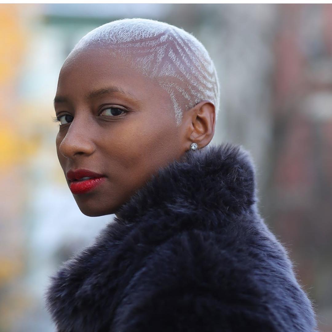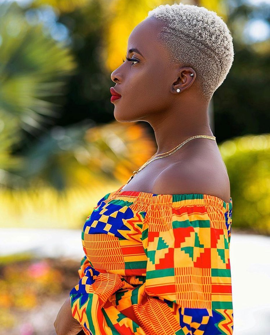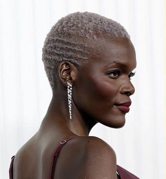 This icy white buzz with subtle curl patterns is perfect for African women who love their curls and natural texture.