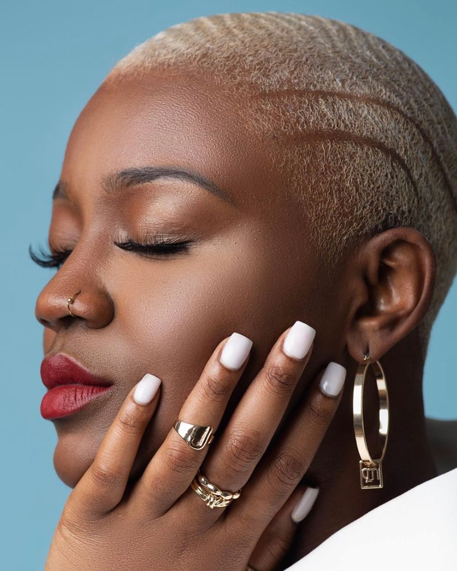 This icy white and detailed buzz design is so easy to maintain. It’s also super creative and I see it a lot on younger women who love to follow TikTok trends.
