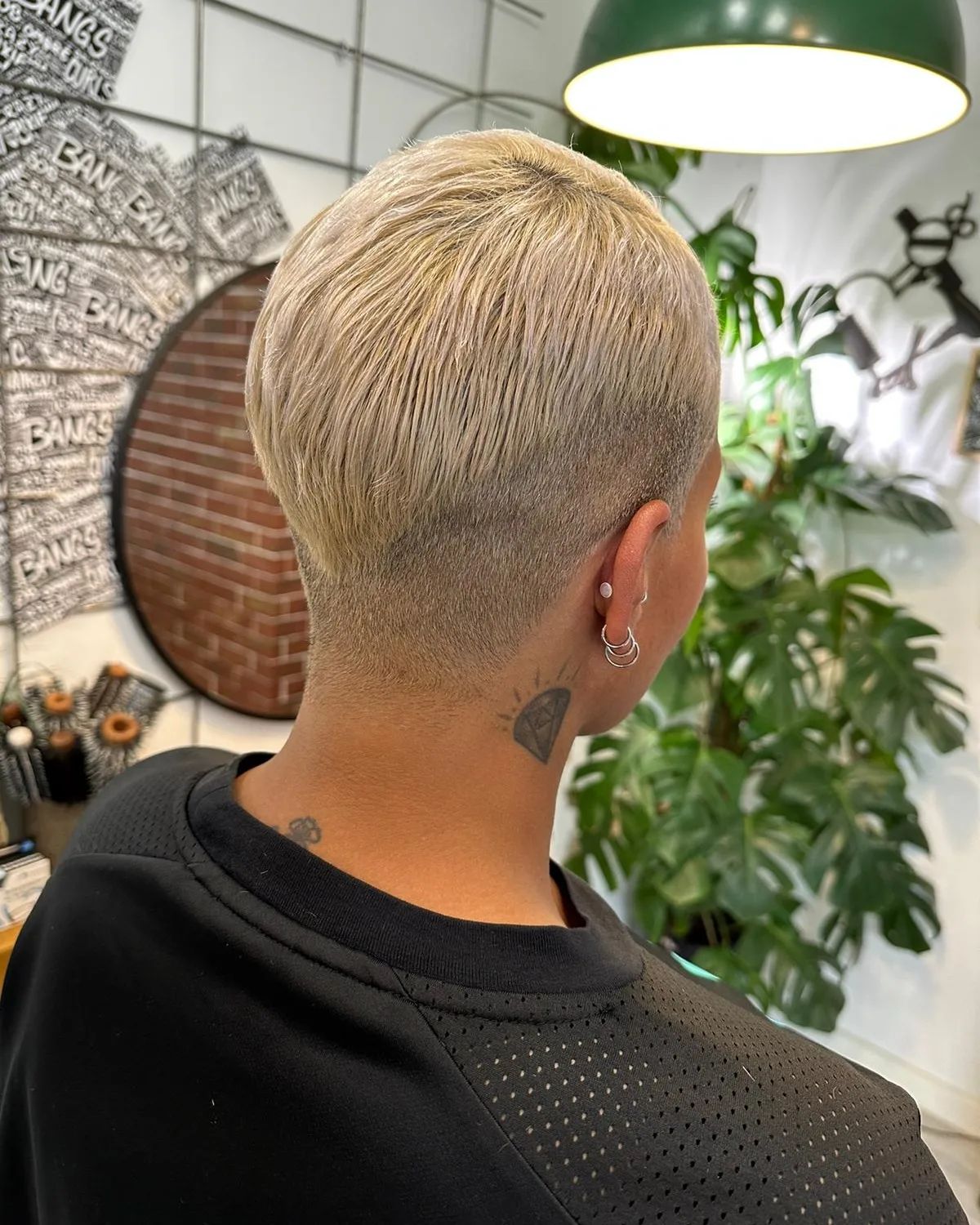To keep this shade looking perfect, you’ll want to color your blonde buzzcut every two months. Going for the right toner is key to maintaining this color.